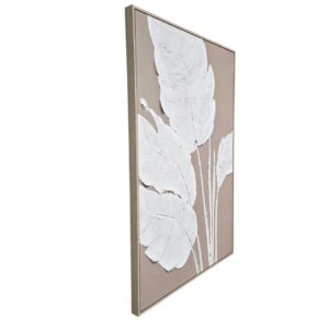 The sculpted, creamy white leaves stand out beautifully against a soft, neutral beige background, creating a sophisticated and minimalist look. The unique texture adds a tangible sense of depth and artistry that transforms a simple motif into a captivating statement piece