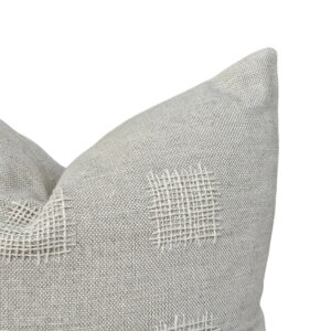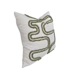 This scatter cushion is a masterpiece of contemporary textile craftsmanship, featuring a rhythmic, abstract landscape-inspired pattern. The design is brought to life through an intricate “punched” embroidery technique, creating raised, plush segments in an earthy sage green tone. These organic, flowing shapes stand out against the soft cream woven base, providing a bold architectural look that mirrors the natural contours of a horizon while remaining versatile enough for modern, global, or bohemian-chic interiors