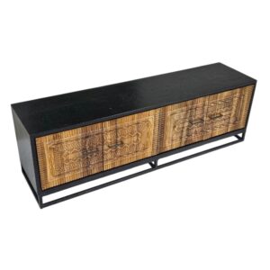 This handcrafted Adur plasma/TV unit is a striking statement piece that combines robust construction with intricate artisan details, making it a functional work of art for any contemporary or rustic living space