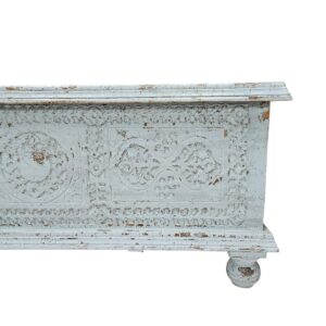 Exquisitely crafted from 100% solid sustainable mango wood, this chest features a unique distressed light blue finish that highlights its intricate hand-carved floral and relief detailing. Each piece is hand-finished by skilled artisans, ensuring that the natural variations in the wood’s grain and the artisanal carvings make your box a one-of-a-kind statement piece