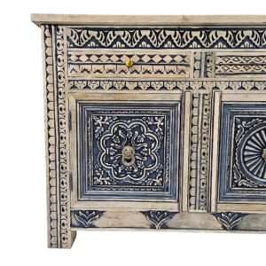 Exquisitely crafted from 100% solid sustainable mango wood, this chest features a unique distressed light blue finish that highlights its intricate hand-carved floral and relief detailing. Each piece is hand-finished by skilled artisans, ensuring that the natural variations in the wood’s grain and the artisanal carvings make your box a one-of-a-kind statement piece