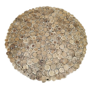 Measuring 60 x 60 cm, this table features a beautifully smooth round top, supported by three robust round log legs, each showcasing the natural grain and warmth of sustainably sourced teak.