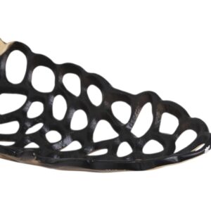 Featuring a robust hand-finished metal construction with a striking matte black patina, this elongated platter showcases a sleek, boat-like silhouette and unique handle cut-outs that celebrate a bold, artisanal look