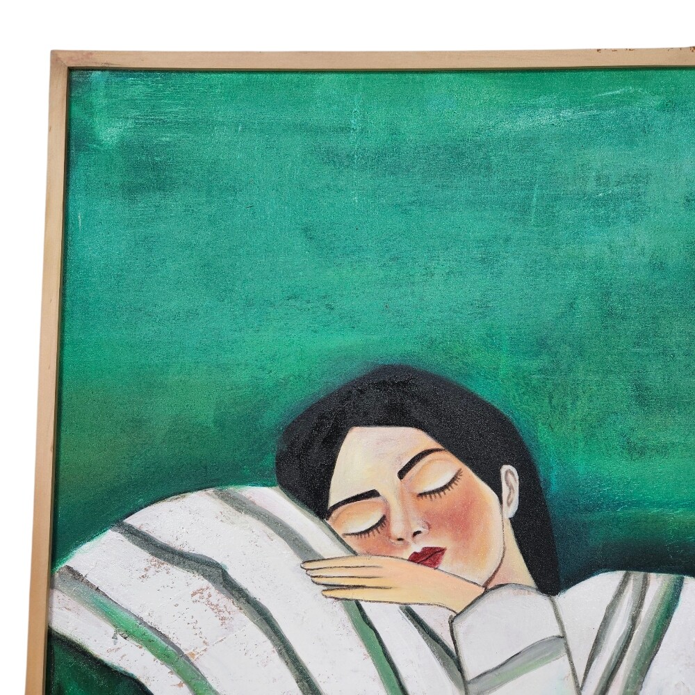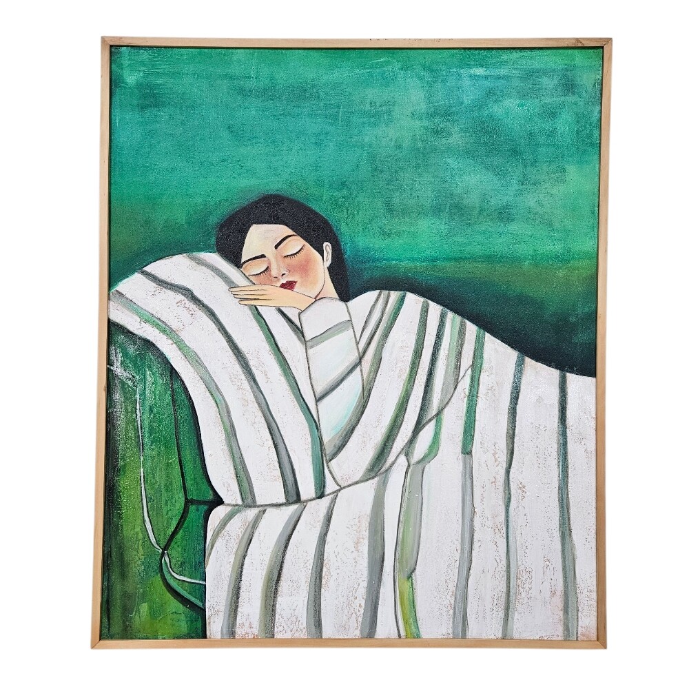 The artwork features a minimalist depiction of a figure resting, draped in a white and green striped blanket against a striking emerald green background. The clean lines, bold colour blocking, and serene subject matter lend this piece a sophisticated modern, minimalist style with a touch of vintage flair