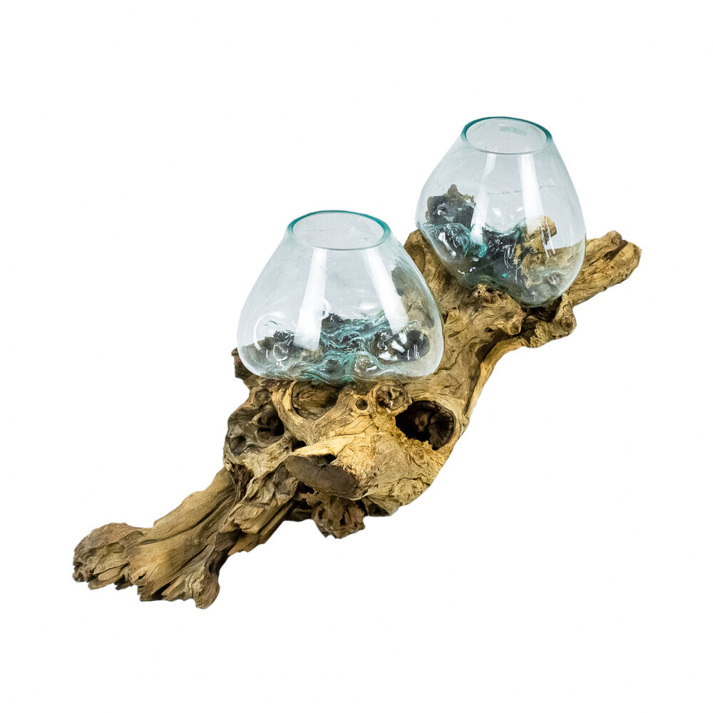 The glass sits on the teak wood root base and is removable for easy filling and cleaning.