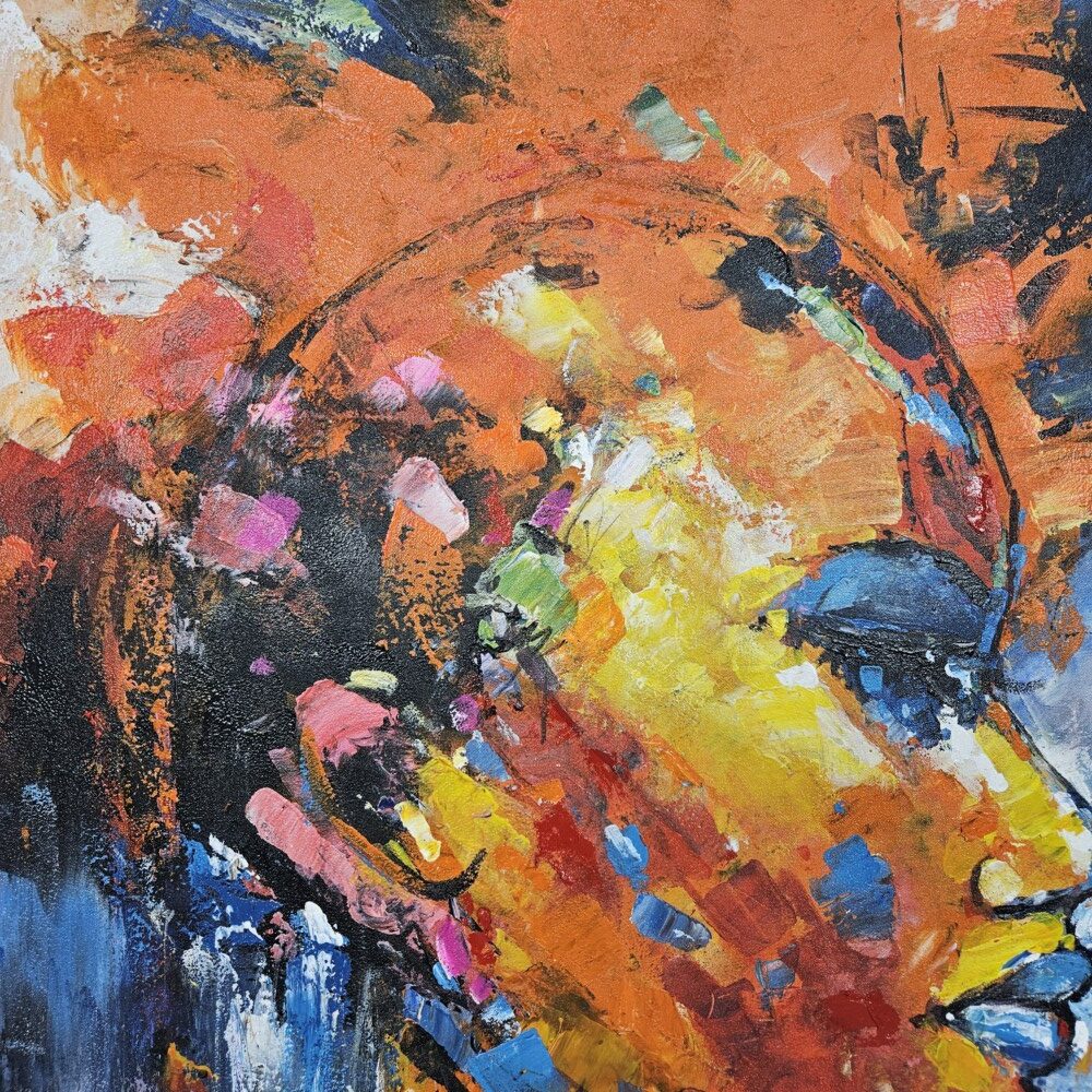 Bursting with bold colors and abstract brushstrokes, this piece showcases the powerful profile of a woman, celebrating African beauty and culture. The dynamic use of orange, blue, and other striking hues creates a captivating and expressive design, embodying both strength and grace