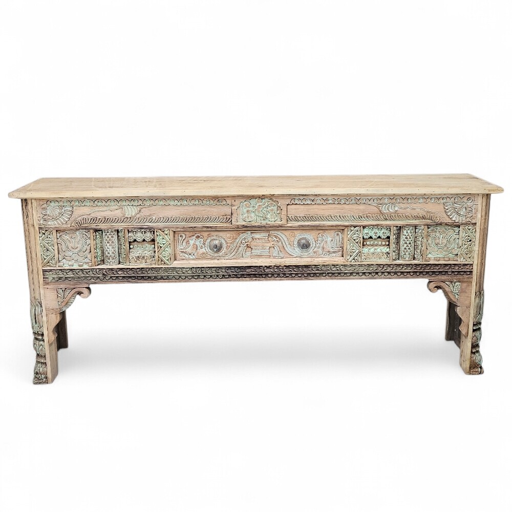 This console table embodies a refined rustic and global-inspired style, characterized by its long, slender silhouette and intricate hand-carved details along the apron. The natural finish of the mango wood provides a soft, matte look that fits perfectly within coastal, bohemian, or farmhouse-style interiors