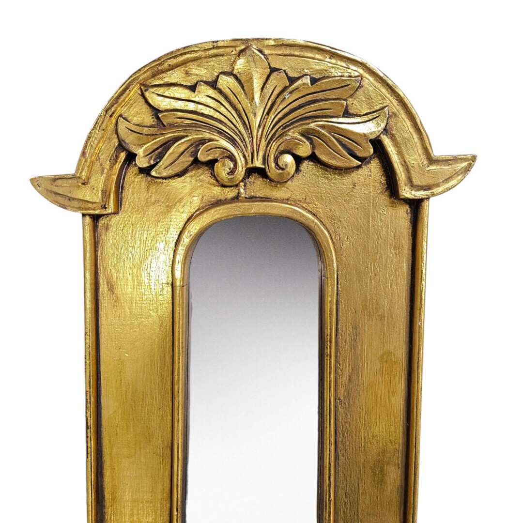 This captivating mirror is a sophisticated, narrow accent piece that adds drama and reflected light to any room with its ornate Antique Gold finish and carved architectural details; this full-length mirror is perfectly sized at 170 cm (Height) x 34 cm (Width) x 4 cm (Depth) for checking your complete outfit while visually expanding vertical space in narrow areas like hallways or between windows
