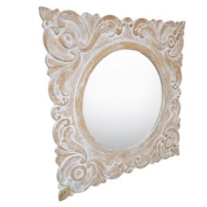 Style: The mirror embodies a Classical/Traditional style, featuring a rectangular main body that transitions into a decorative Arch/Pediment Crest at the top. The top and bottom of the frame are detailed with intricate carved acanthus leaf and scrollwork, evoking a vintage European aesthetic