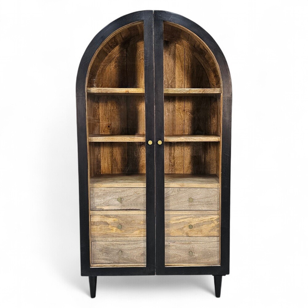 Meticulously handcrafted from sustainably sourced solid mango wood, this 1.7-meter-tall statement piece features elegant arched glass doors and internal shelving that serve as a sophisticated sculptural focal point for any interior