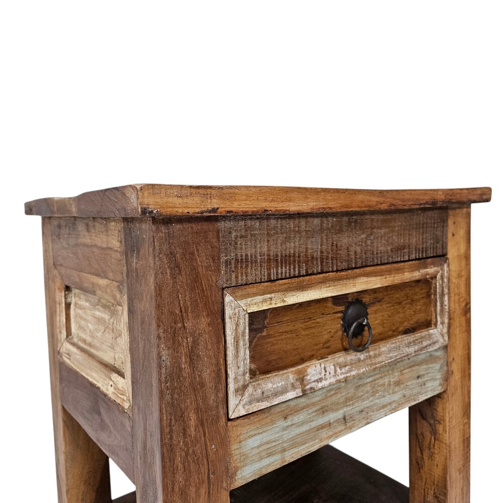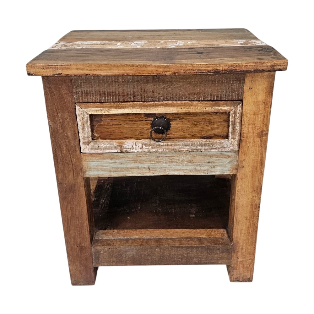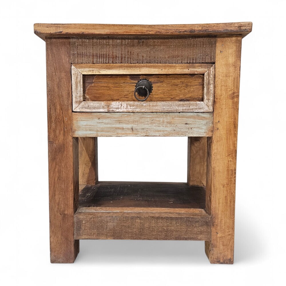 This charming, hand-crafted bedside pedestal, measuring 50 cm high, 33 cm depth, and 44 cm wide, is built from solid Mango Wood, celebrating a natural, rustic and distressed style