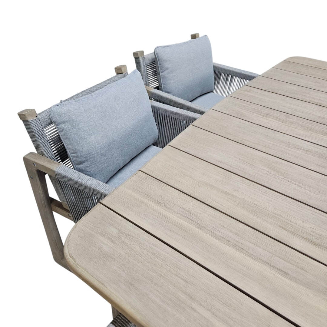 Sustainable Craftsmanship & Robust Design: Constructed from 100% FSC (Forest Stewardship Council) approved acacia wood, this set not only guarantees a product of superior quality but also underscores a commitment to environmentally responsible forestry. Acacia wood is renowned for its natural resistance to the elements, including rot and insects, making it an ideal choice for patio furniture.