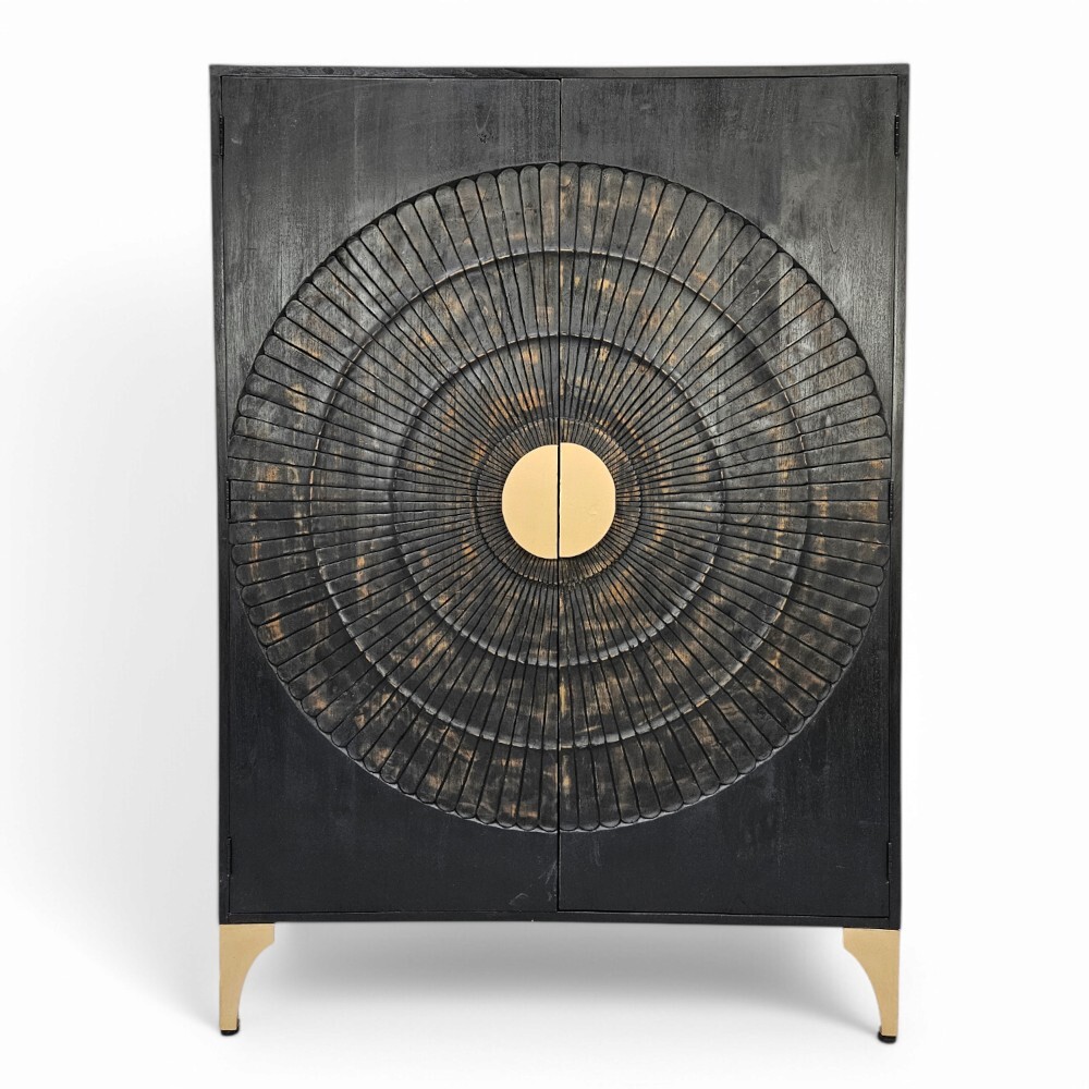 Measuring 120cm (L) x 50cm (W) x 170cm (H), this cabinet features a striking hand-carved circular sunburst design on its double doors, accented by golden center handles for a dramatic contrast. Crafted from premium wood, the deep black finish enhances its contemporary appeal, while the elegant gold metal legs provide stability and a refined look.