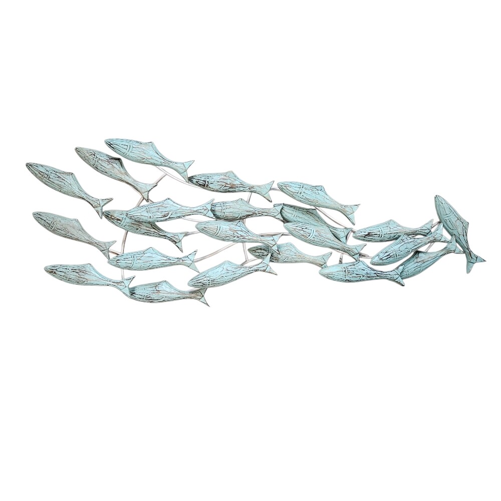 This coastal-inspired panel features a school of meticulously hand-carved wooden fish, each mounted at varying depths on a sleek metal frame to create a striking 3D effect. The style is defined by a sense of movement, with the fish arranged as if they are gliding through water, while their weathered, white-patina or natural wood finishes add a rustic, maritime charm to the design