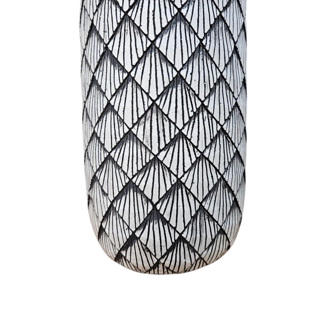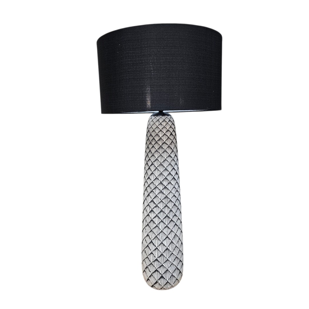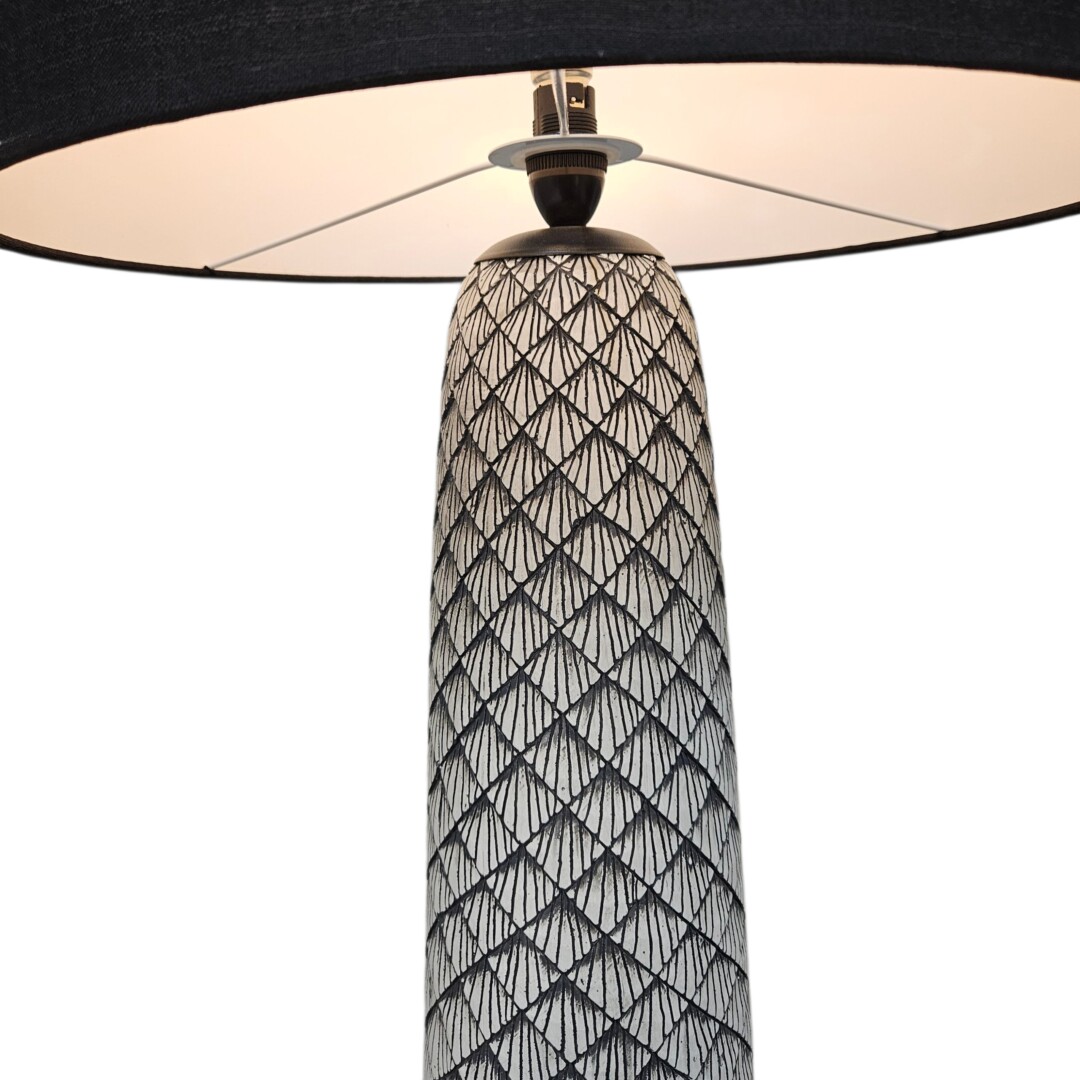 The lamp’s most striking feature is its tall, cylindrical base adorned with a tactile diamond or scale-like pattern. This intricate texture, possibly in a white or off-white finish with dark accents, creates a sophisticated and modern aesthetic that plays with light and shadow