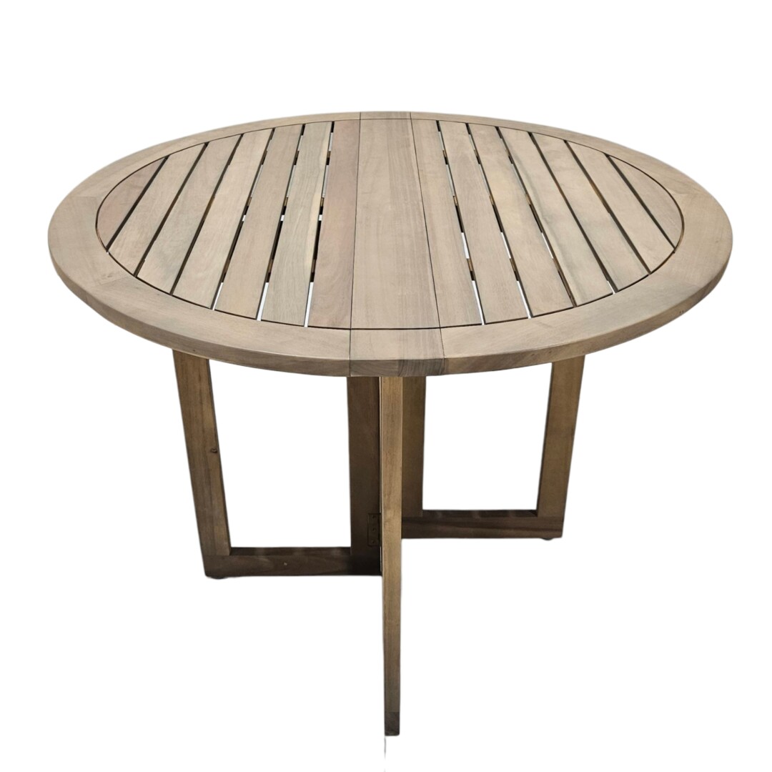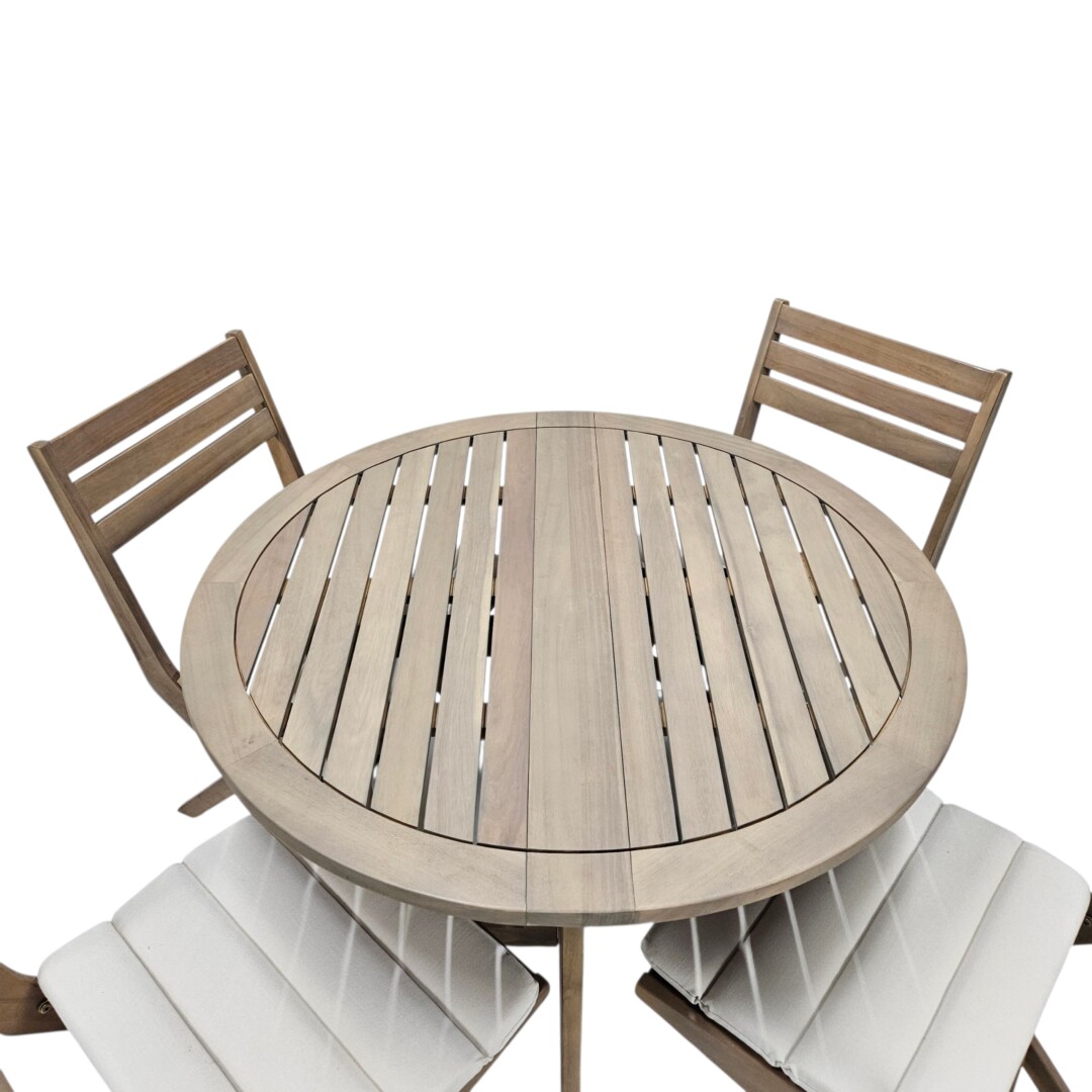 The set features a classic round slatted dining table and four accompanying chairs, perfectly sized for family meals or entertaining friends