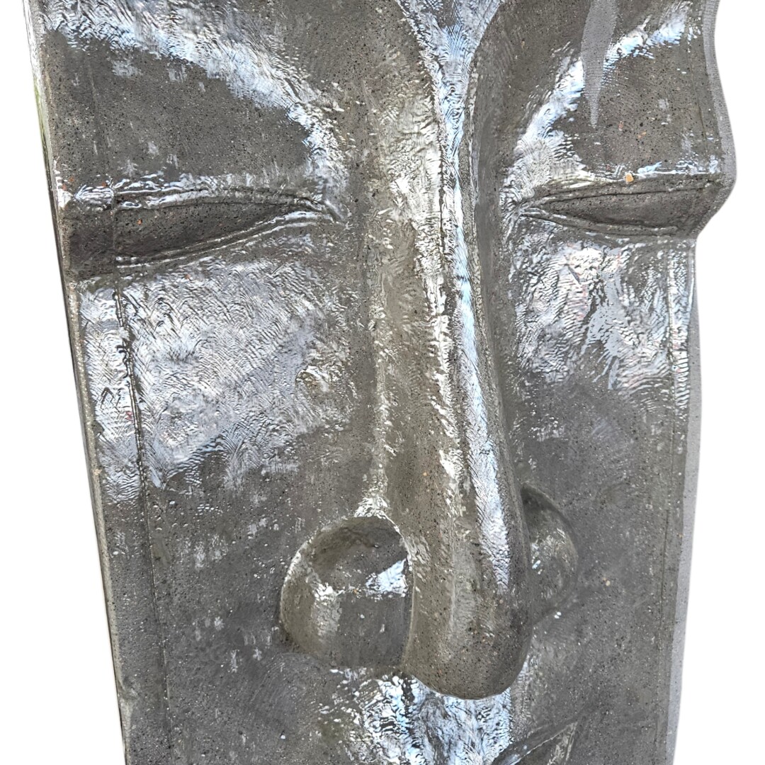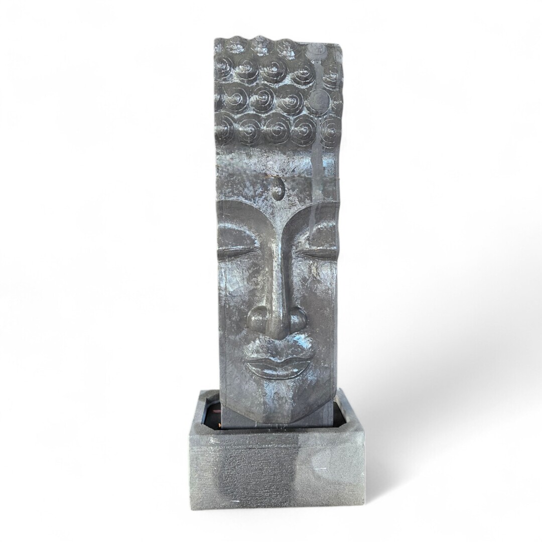 Featuring a meticulously hand-finished Buddha face with a weathered “antik” stone patina, this towering feature offers a sleek, multi-tonal aesthetic as water cascades gently down the textured surface, creating a soothing, streamlined atmosphere for contemporary outdoor spaces