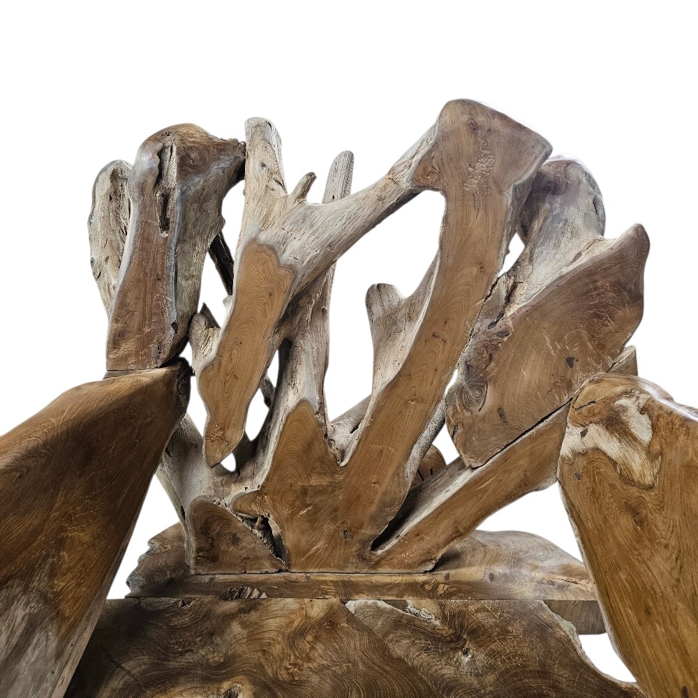 This extraordinary chair is expertly crafted from the reclaimed roots of the majestic teak tree, embodying a raw, organic, and sculptural style. Because it is carved from natural roots, no two chairs are exactly alike, featuring unique structural fissures, intricate knots, and a captivating live-edge silhouette that transforms any space into a gallery-like setting