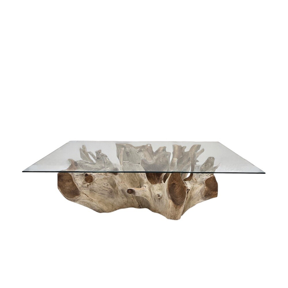 Introduce a magnificent centerpiece to your living room with this Handcrafted Burmese Teak Root Rectangular Coffee Table. This exquisite piece captures the raw, untouched artistry of nature, featuring a stunning, sculptural teak root base topped with a sleek, modern glass surface