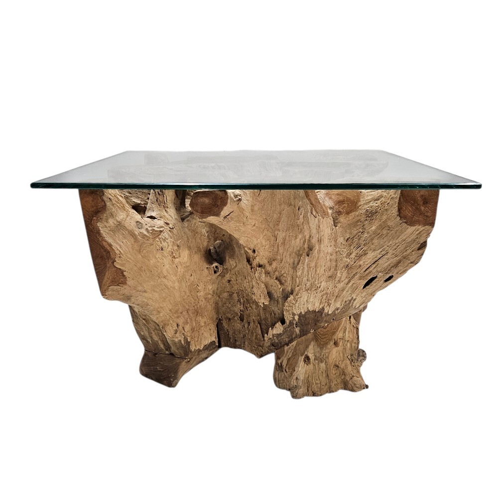 Topped with a sleek 70 x 70 cm (L x W) tempered glass surface, the table beautifully showcases the sculptural root base while providing a smooth, practical area for everyday use. The combination of raw natural wood and modern glass creates a striking balance of organic warmth and contemporary style