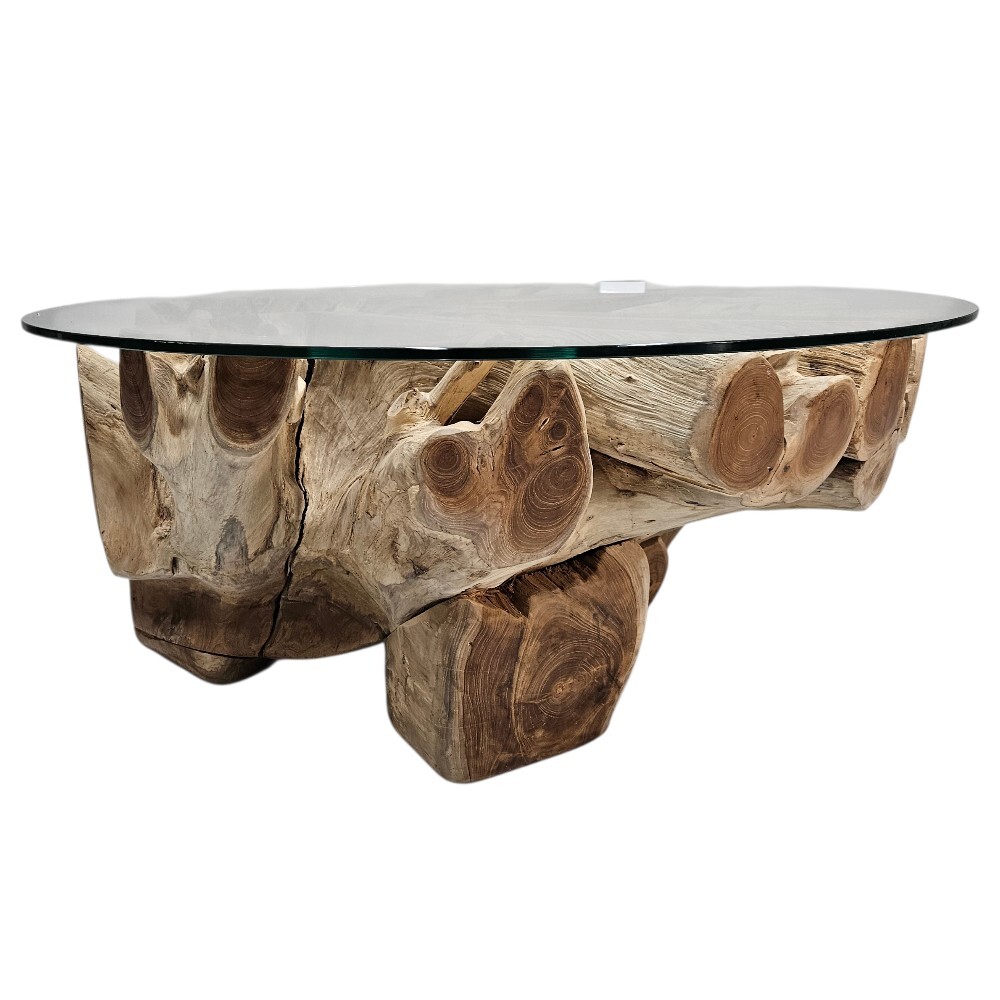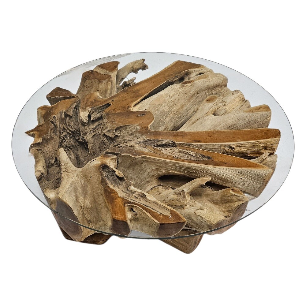 This exceptional, organically made Teak Root Block Coffee Table captures the raw, natural beauty of solid teak wood. The dimensions of this piece are approximately 100 cm in diameter and 45 cm in height. The organic style of this table means that no two pieces are exactly alike, providing a truly singular statement for your living space