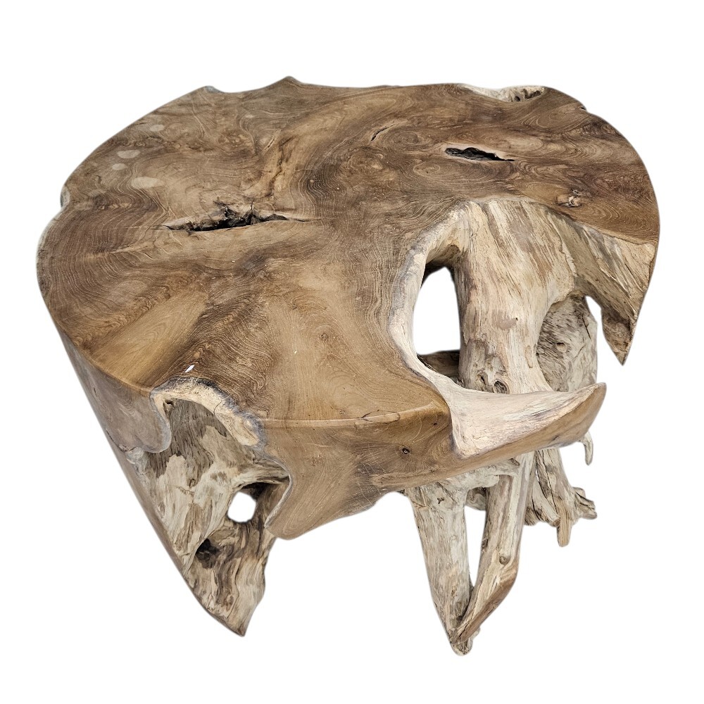 Expertly crafted from a single, reclaimed teak root, each table top showcases the intricate rings, knots, and unique structural fissures of the wood, making it a spectacular piece of natural art