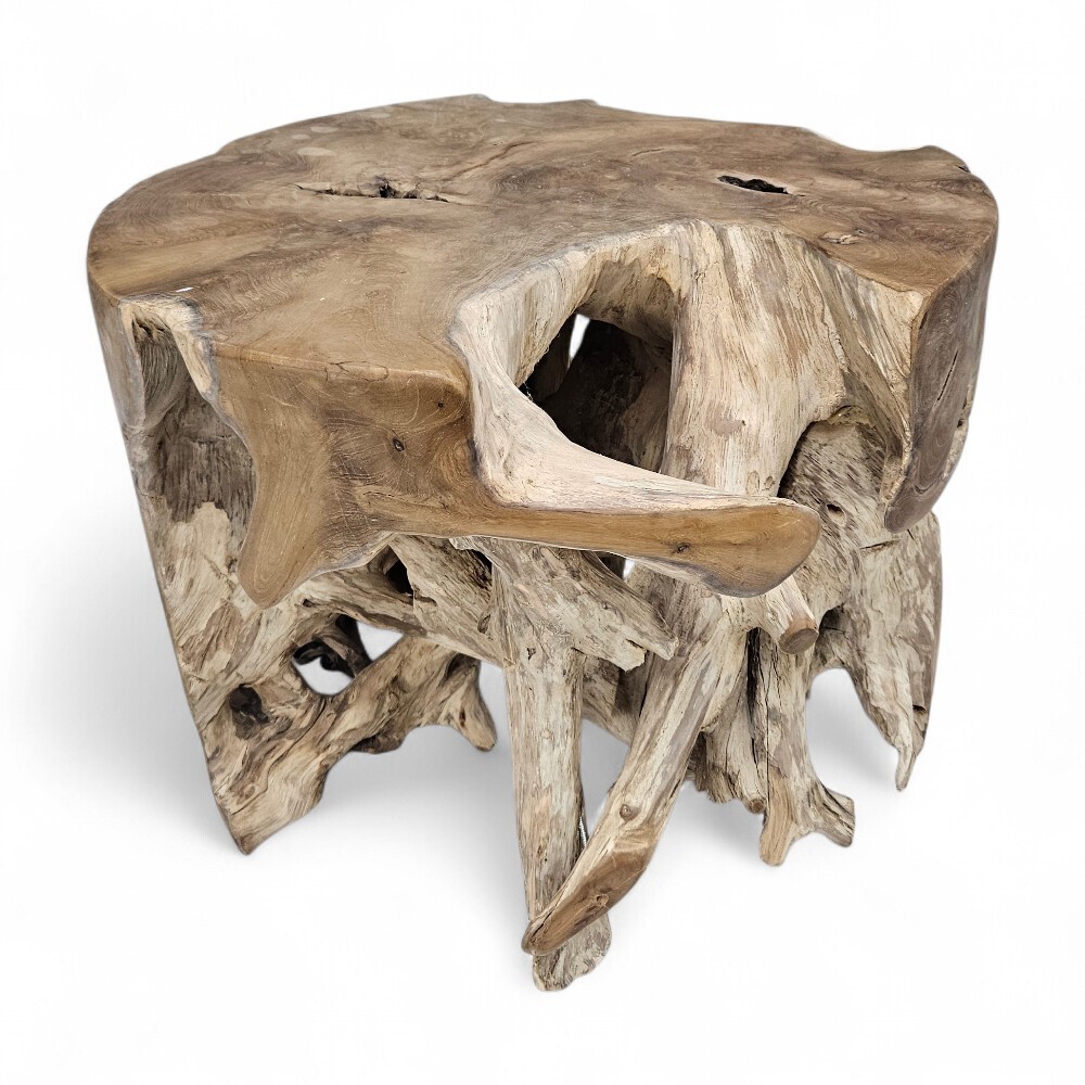 This exceptional, organically made Burmese Teak Tree Root Side Table captures the raw, natural beauty of solid teak wood. The dimensions of this piece are approximately 60 cm in diameter and 40 cm in height. The organic style of this table means that no two pieces are exactly alike, providing a truly singular statement for your living space
