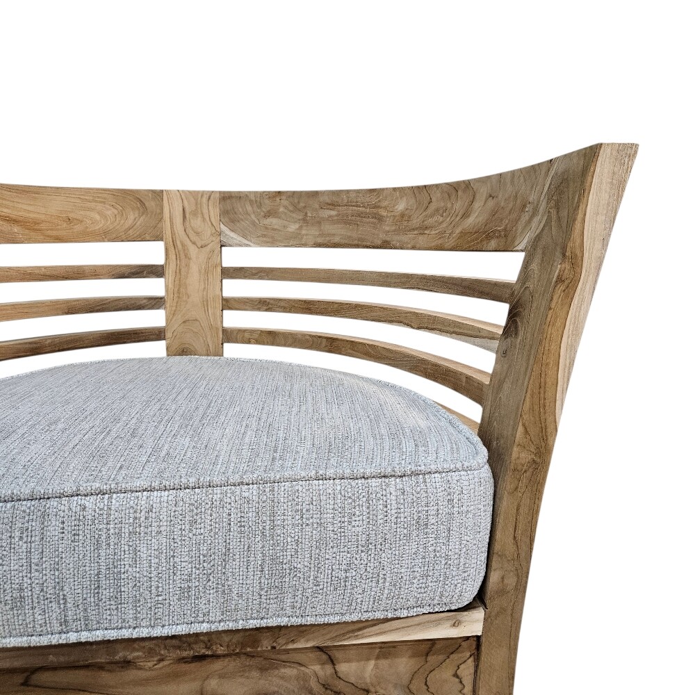 • Comfortable Padded Seating: The expansive semi-circular seat is fitted with a premium, high-density foam cushion upholstered in a neutral, textured grey fabric, providing a soft contrast to the rigid lines of the teak frame