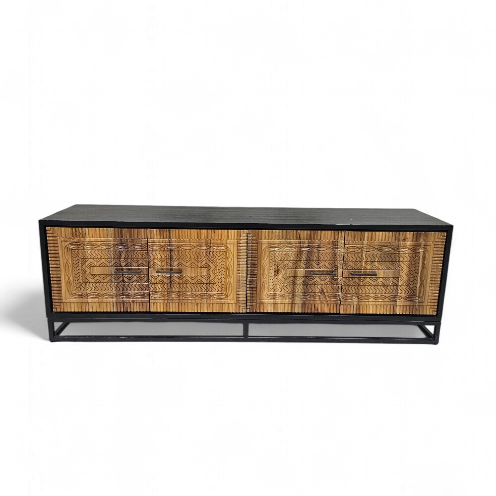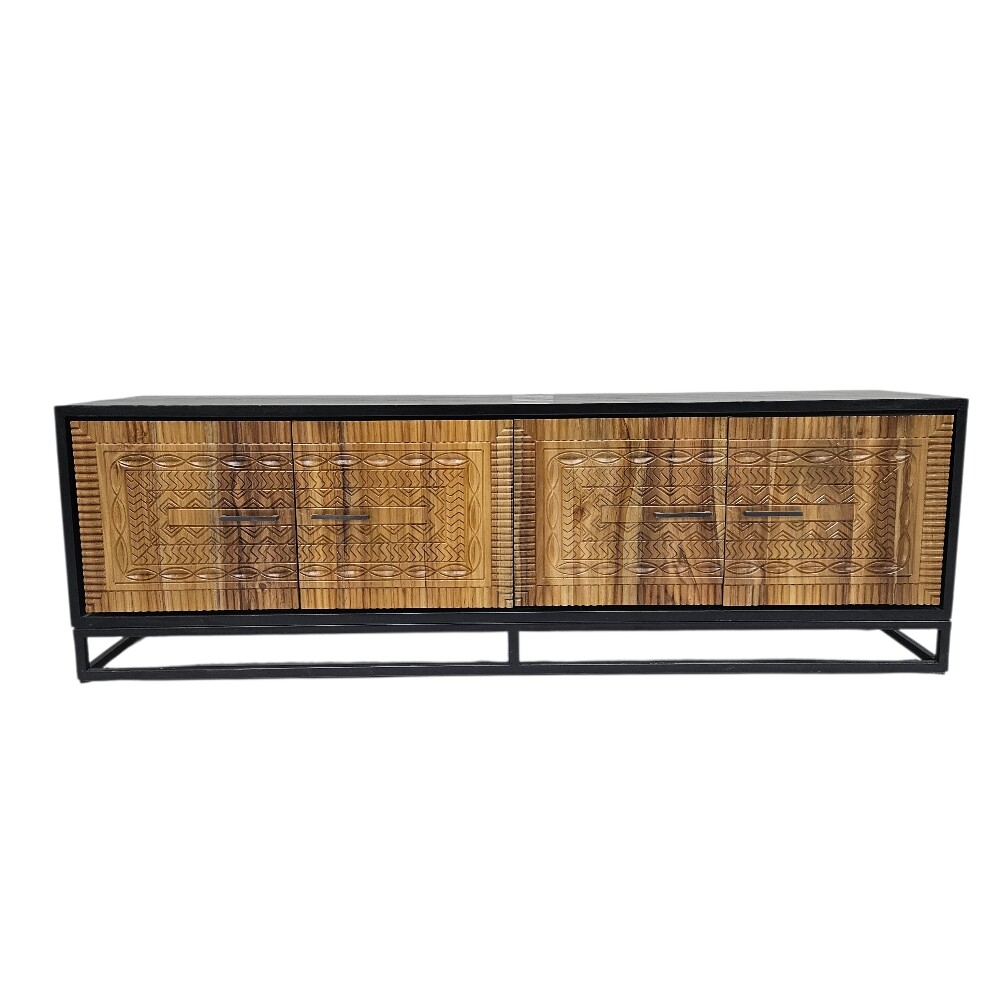 This piece showcases a stunning global-inspired style, characterized by the intricate, hand-carved geometric patterns on the teak door fronts. The natural warmth of the teak wood is beautifully framed by a sleek, black finished casing and a minimalist metal sled base, creating a sophisticated industrial-chic look
