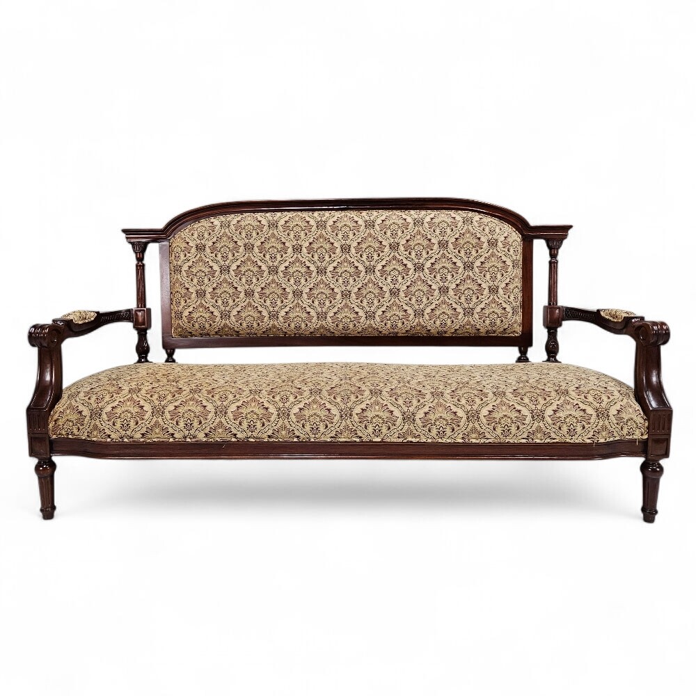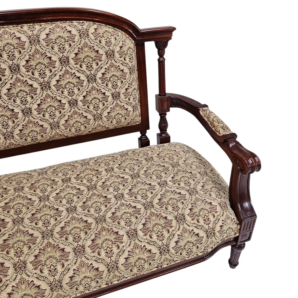 Crafted from richly finished mahogany, the sofa features a distinctive exposed wood frame with elegant curves and decorative turnings, characteristic of the Traditional Louis Philippe or Regency style. The wood boasts a deep, lustrous patina that beautifully contrasts with the intricate upholstery