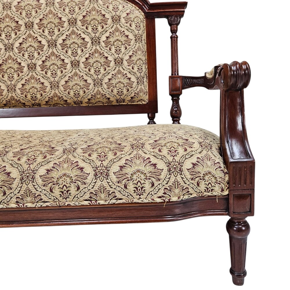 The backrest and generous seat are covered in a rich, woven damask or jacquard fabric featuring a traditional medallion-and-foliage pattern in warm tones of burgundy, gold, and taupe. Key structural elements—such as the fluted arm supports, carved arm terminals, and turned legs—are expertly detailed, adding an air of architectural refinement to this comfortable two-to-three-seater settee