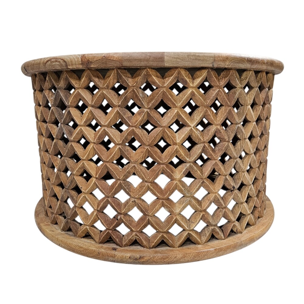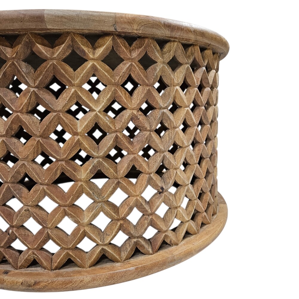 This handcrafted Carsyn Carved coffee table is a stunning artisanal piece that blends traditional Indian craftsmanship with a versatile, modern silhouette