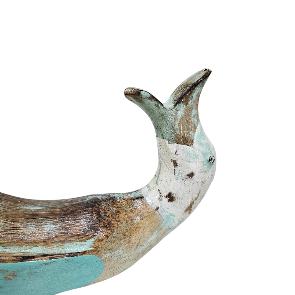 This delightful hand-carved wooden wine holder, measuring 30 cm high, 18 cm in depth, and 26 cm wide, brings a playful, rustic accent to your kitchen counter, bar, or dining room. Expertly crafted from wood with an antique, distressed turquoise and natural finish, this unique duck is designed to hold a standard wine bottle securely