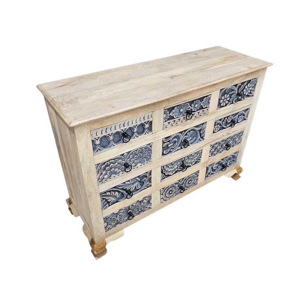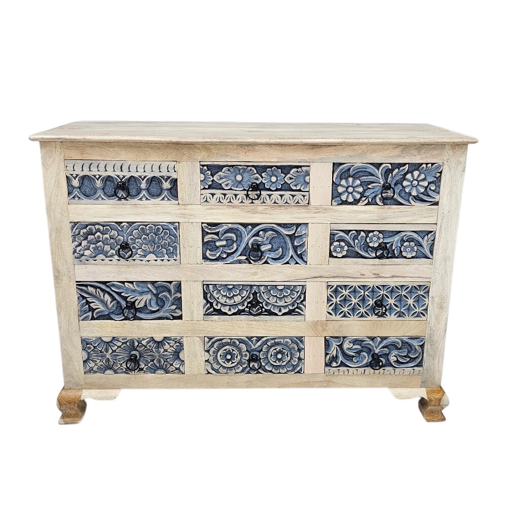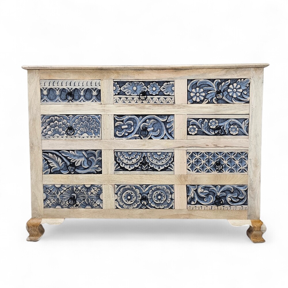 This piece embodies an elegant coastal and global bohemian style, characterized by its stunning hand-carved facades. Each of the drawer fronts features unique floral and geometric patterns carved directly into the wood, which are then accented with a soft blue-grey wash to highlight the depth of the craftsmanship