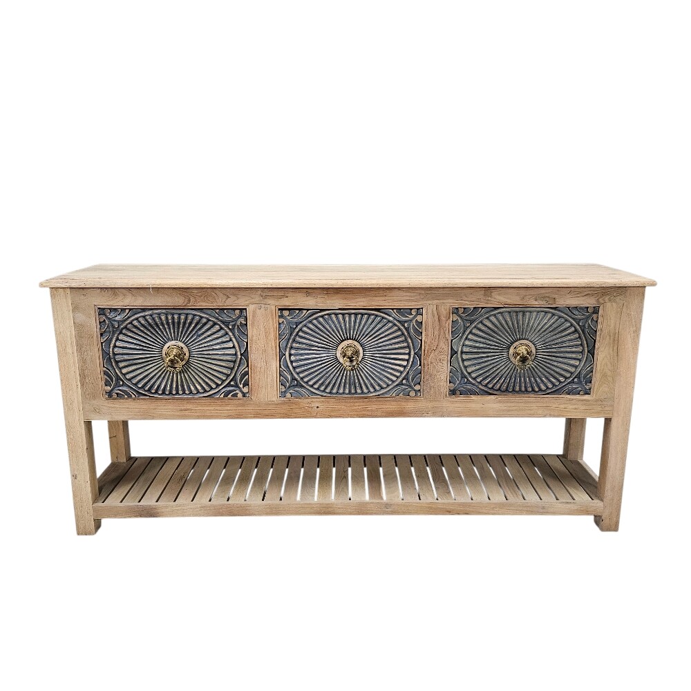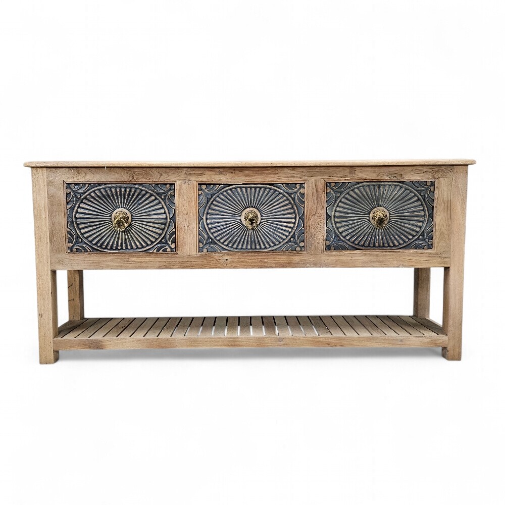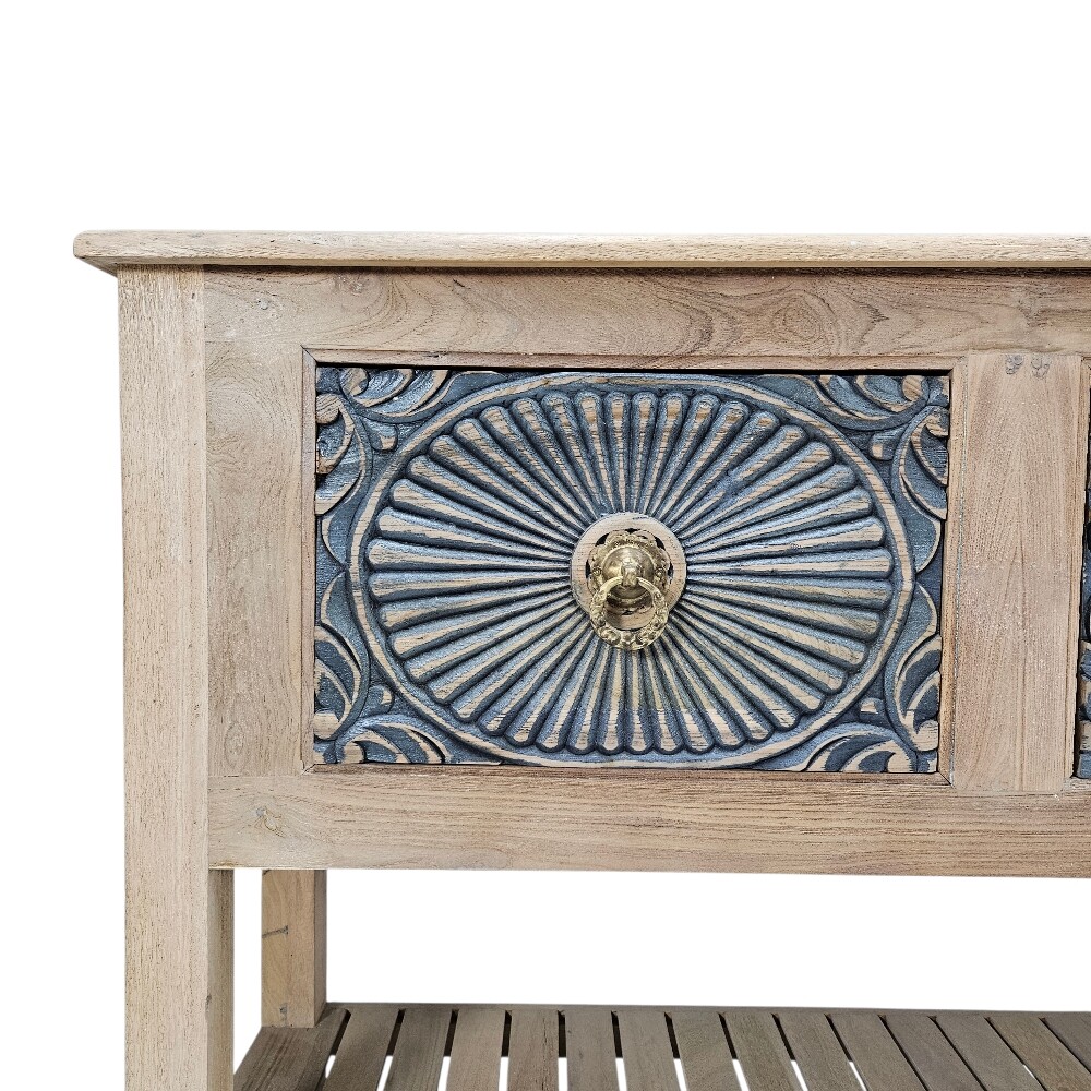 Handcrafted from 100% solid sustainable mango wood, this table is a showcase of intricate hand-carved detailing that reflects centuries of traditional craftsmanship. The design features an exquisite “Lazuli” or deep-wash finish that emphasizes the three-dimensional depth of its floral and geometric reliefs, creating a sophisticated and unique aesthetic