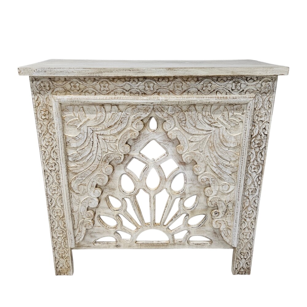 Handcrafted from 100% solid sustainable mango wood, this table features elaborate hand-carved details that reflect traditional Indian artistry. The intricate peacock or floral motifs across the apron and frame showcase the unique variations of the natural wood grain, ensuring that every piece is a one-of-a-kind work of art