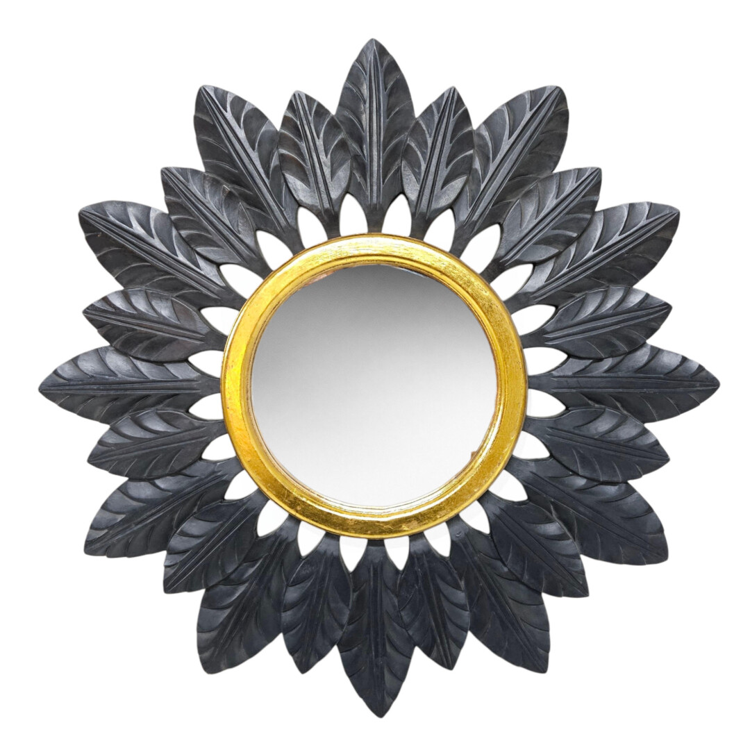 Style: The mirror features an iconic sunburst design with a distinct tropical or carved leaf motif rather than traditional rays, giving it a unique, organic feel. The central mirror is framed by a sleek, luxurious gold band. The outer ‘rays’ feature a bold, dark black finish, creating a dramatic contrast
