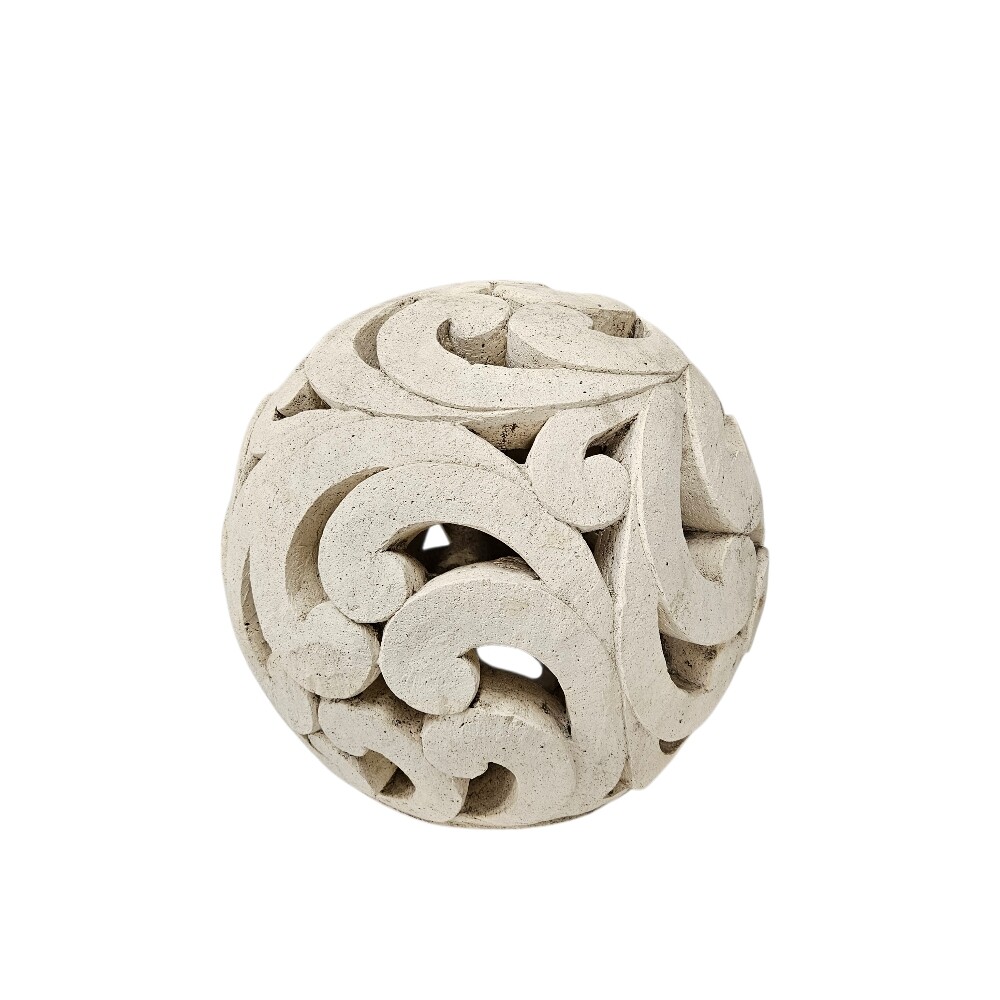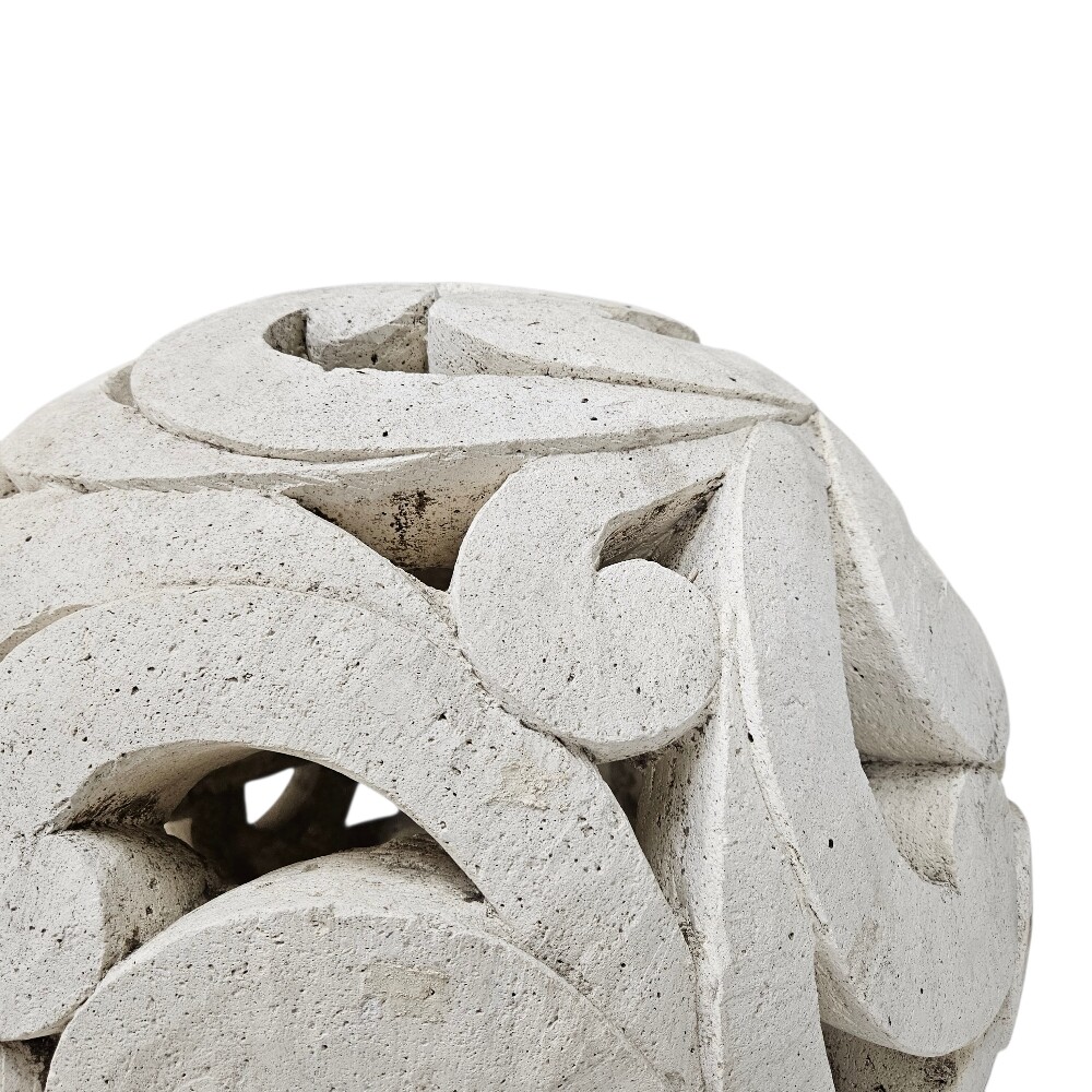 This lamp is masterfully crafted from durable cement, featuring a bold and organic style inspired by fluid, swirling patterns. Its spherical, open-work design allows light to cast intricate shadows, creating a magical and serene atmosphere in any outdoor setting