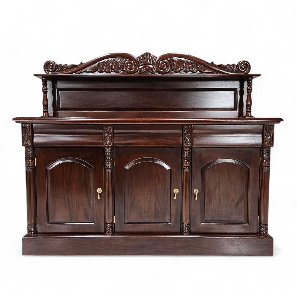 Meticulously hand-made from rich, solid mahogany, this sideboard is a superb reproduction of the classic Victorian/Regency style. It features a beautiful, deep reddish-brown finish that highlights the wood’s fine grain and a stunning high back that distinguishes it as a true chiffonier. The back panel is topped with a bold, intricately carved scroll and acanthus leaf crest, adding exceptional visual height and decorative flair