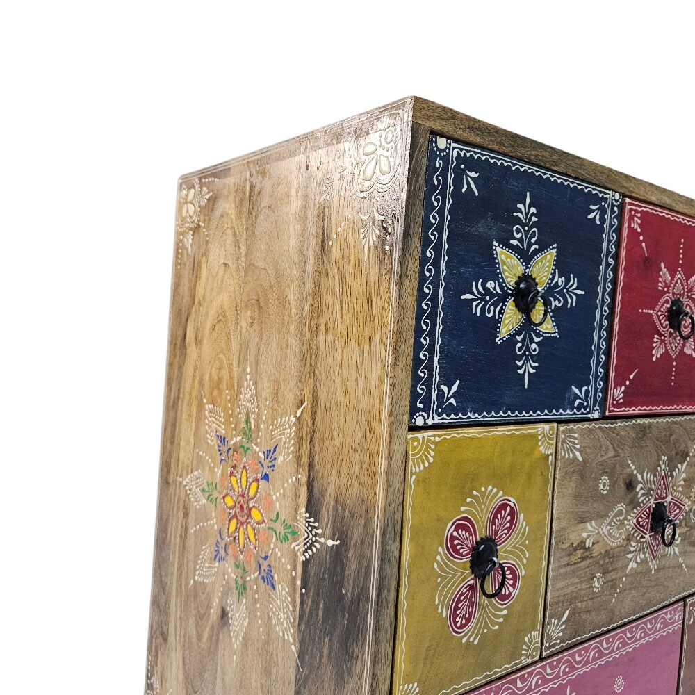 Add a burst of vibrant energy and cultural flair to your home with this stunning hand-painted mango wood chest of drawers. Expertly crafted from high-quality, sustainably sourced mango wood, this compact dresser is a celebration of traditional craftsmanship and bohemian style