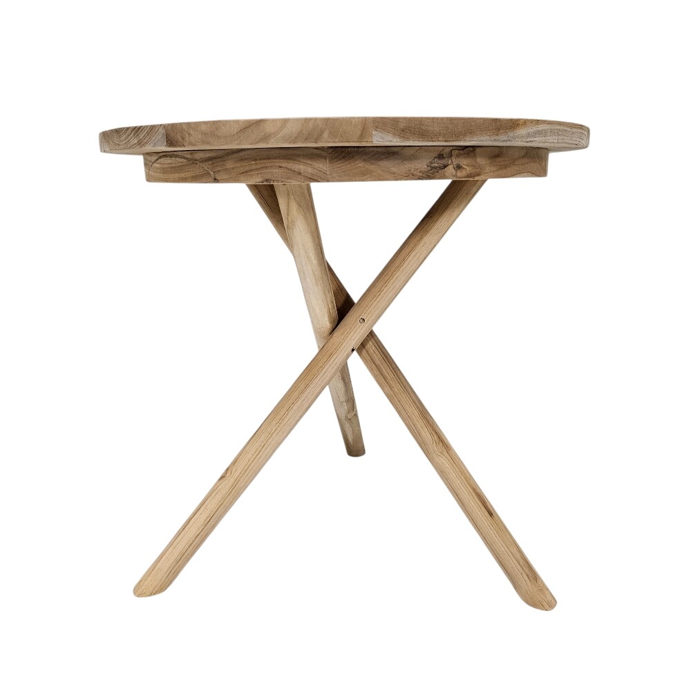 This table is masterfully crafted from high-quality teak, showcasing a minimalist yet architectural style that emphasizes the wood’s organic beauty. Its standout feature is the unique triple-leg design, where the legs intersect in a tripod arrangement to create a stable and visually intriguing base