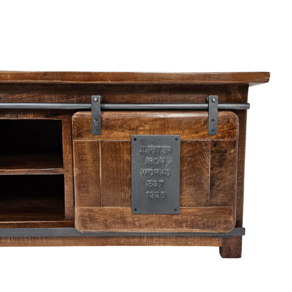 Elevate your living space with the distinctive charm of our industrial TV stand, meticulously crafted from sustainably sourced mango wood