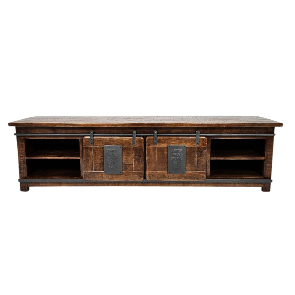 The standout feature of this TV stand is its sliding doors, each adorned with intricate iron detailing. These doors not only add a touch of industrial flair but also provide easy access to your media essentials, ensuring everything is organized and within reach
