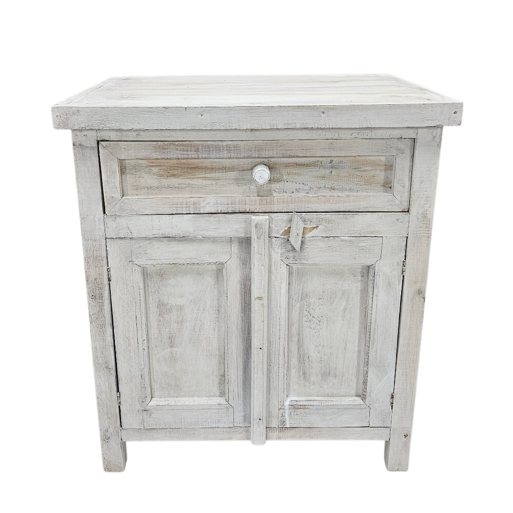 This lightweight nightstand is defined by its sun-drenched distressed white finish, perfectly mimicking the weathered look of driftwood and salty air