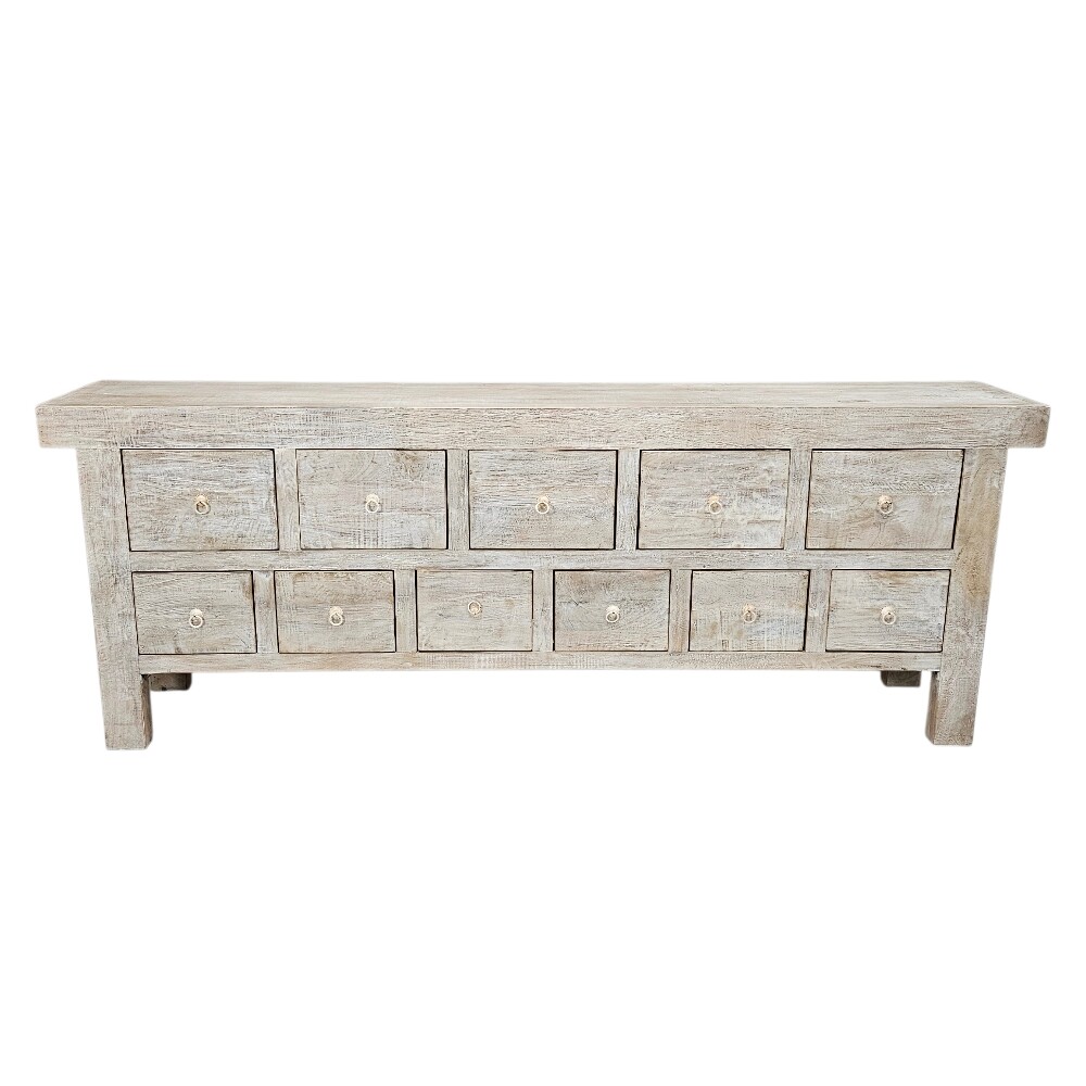 This console table features a rustic apothecary style, meticulously crafted from solid mango wood with a weathered, whitewashed finish that highlights the natural beauty of the timber. Its elongated design and multi-drawer facade bring a sense of vintage charm and historical character to any room, making it a sophisticated focal point for larger hallways or open-plan areas