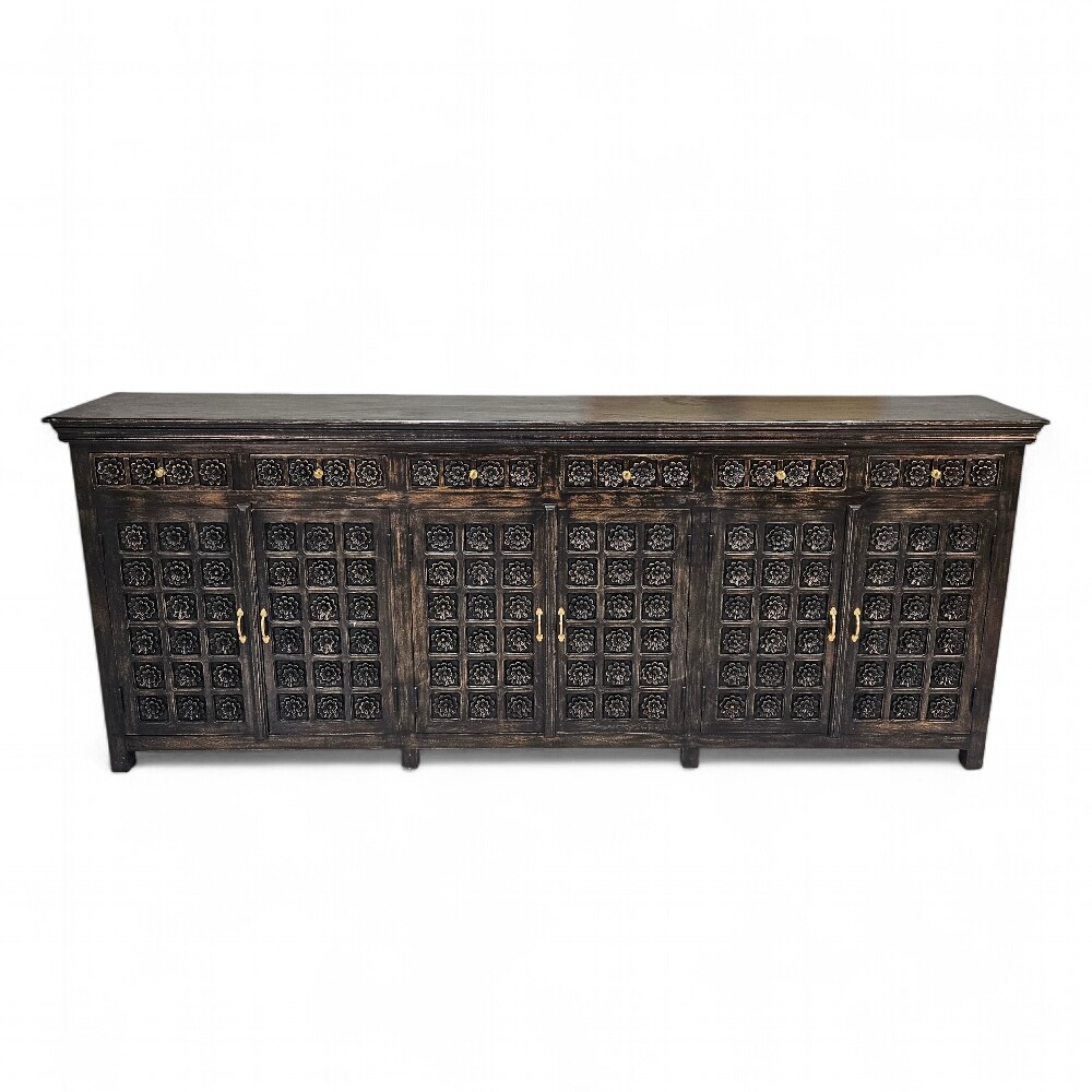 This grand piece is expertly crafted from solid mango wood, showcasing a sophisticated global-inspired style with a deep, dark brown finish. Its most impressive feature is the extensive hand-carved detailing across the six drawer fronts and six cabinet doors, each featuring a repetitive floral-in-square motif that adds incredible texture and architectural depth to your space