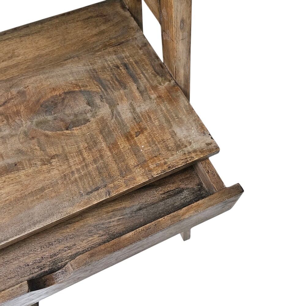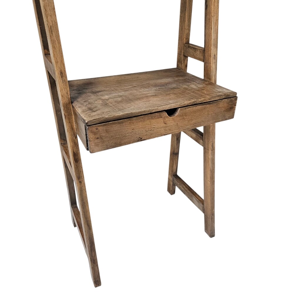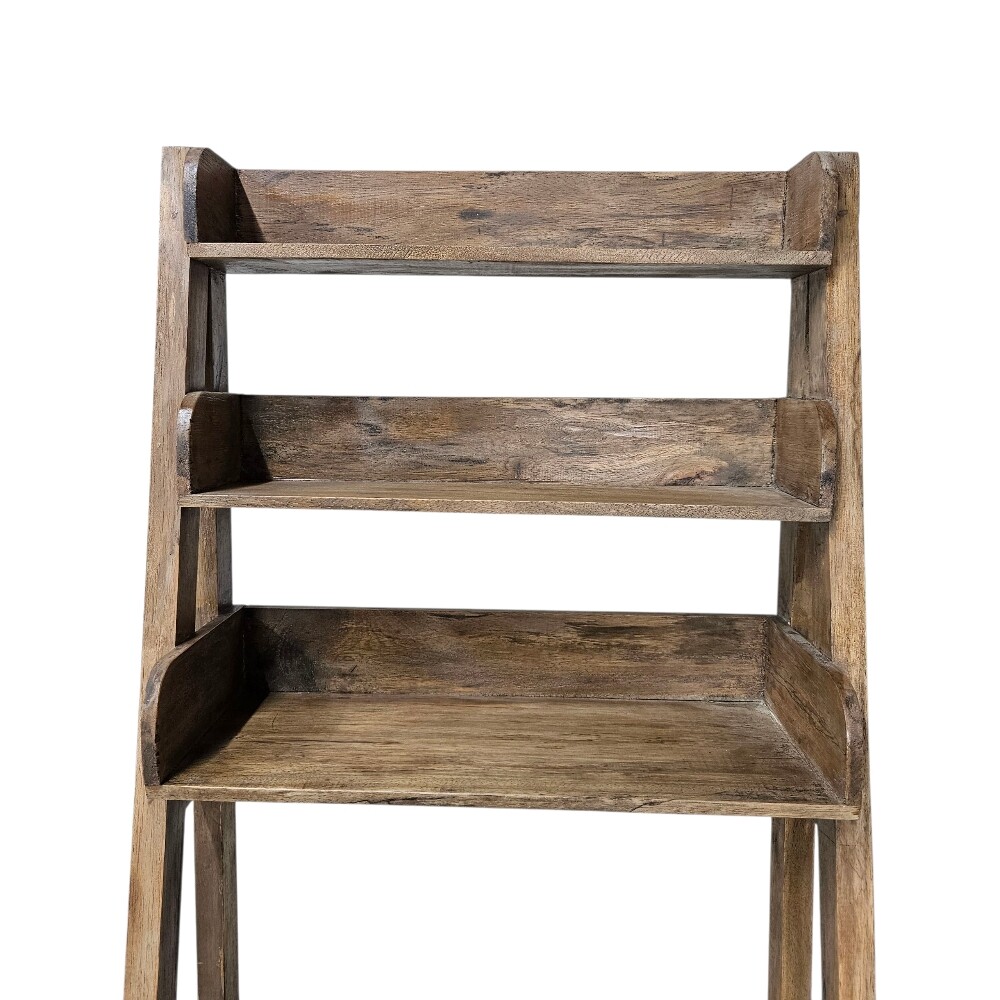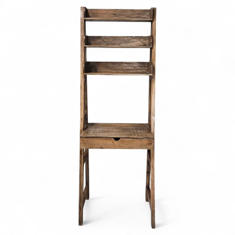 Crafted from rich, distressed wood, its ladder-back structure and single lower drawer offer a vintage, rustic aesthetic perfect for elevating any small space. Its tiered shelving provides versatile vertical storage for books and decor, while the integrated desk surface gives you a dedicated spot for writing or a laptop, making it the ideal space-saving solution for organized living