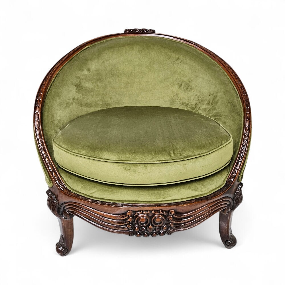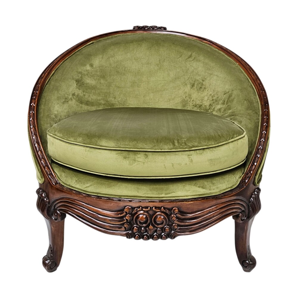Crafted with a richly stained mahogany frame, the chair features deeply carved details—including elegant scrolling on the legs and a carved cartouche along the front apron—all hallmarks of the refined Empire French Inspired style. The chair is beautifully upholstered in plush, olive-green velvet, contrasting richly with the dark wood and offering a sumptuous seating experience. The rounded, tub-like back and thick, removable cushion provide luxurious support, making it as comfortable as it is decorative