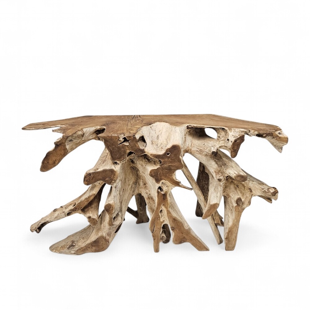 This magnificent console table, with dimensions of approximately 150 cm across, 40 cm in depth, and 80 cm high, is crafted from a spectacular cluster of reclaimed teak roots. The organic naturalist style of this piece ensures it serves as an unparalleled visual anchor in any room