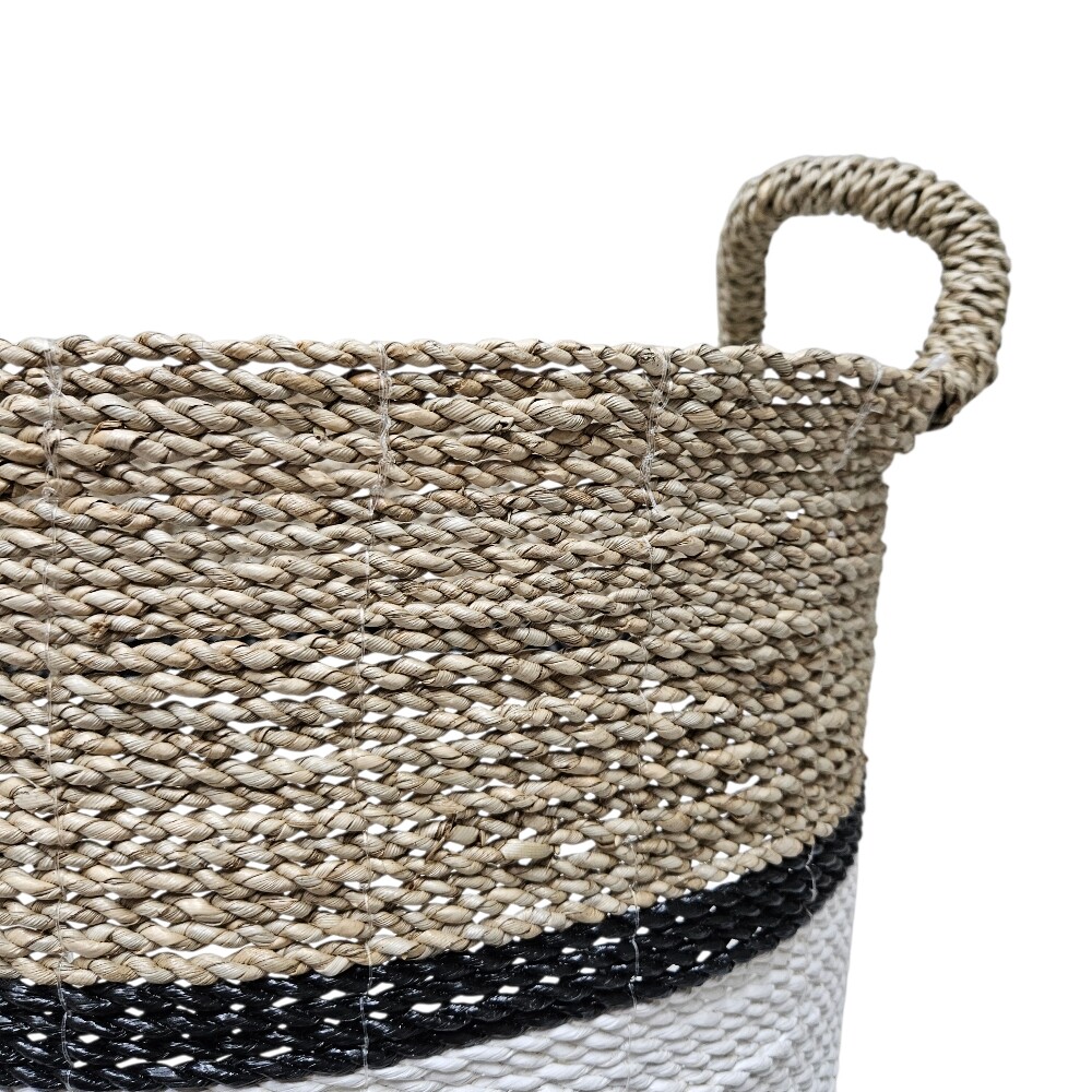 Meticulously hand-woven from a premium blend of natural seagrass and soft raffia, this cylindrical basket showcases a striking multi-tonal aesthetic. The contrasting weave patterns celebrate the raw, botanical beauty of the fibers, while the reinforced, integrated handles offer a grounded and practical character